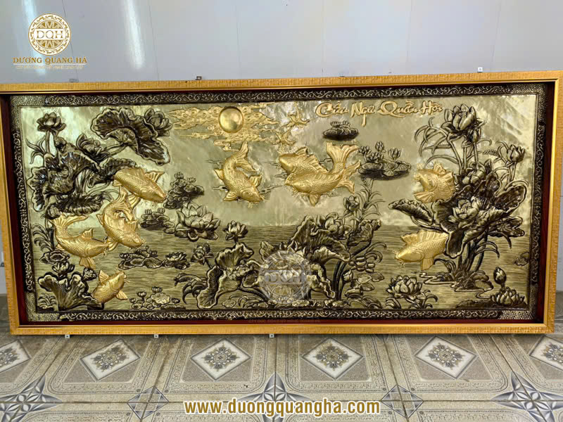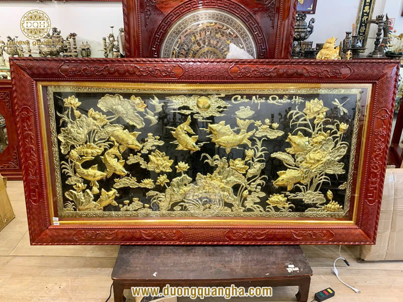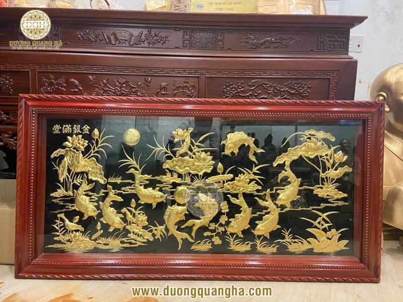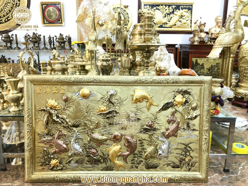 - Tranh Cửu ngư quần hội bằng đồng: Đây là loại tranh mang lại cảm giác sang trọng và bền đẹp. Tranh đồng thường được chạm khắc tỉ mỉ, tinh xảo, với từng chi tiết cá chép được làm nổi bật, tạo hiệu ứng 3D sống động. Chất liệu đồng còn có tác dụng phong thủy tốt, giúp gia tăng sự cứng cáp, kiên định và bảo vệ tài lộc cho gia chủ.